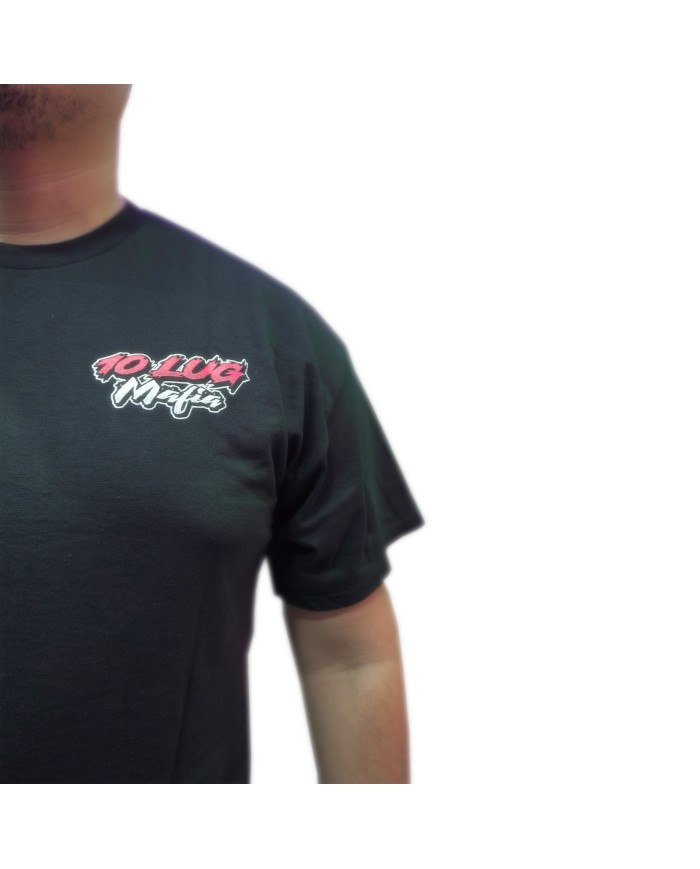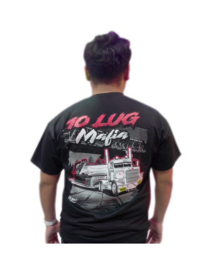 Peterbilt day cab lowboy with wide load artwork on back of shirt